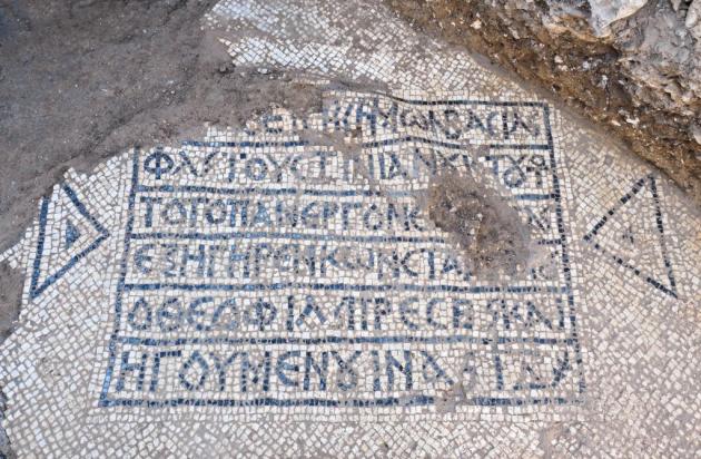 Η πλήρης επιγραφή αναφέρει: «Ο πιο ευσεβής Ρωμαίος αυτοκράτορας Φλάβιος Ιουστινιανός και ο πιο θεοσεβής ιερέας και ηγούμενος, Κωνσταντίνος, ανέγειραν το κτήριο στο οποίο (αυτό το μωσαϊκό) τοποθετήθηκε κατά την 14η ένδειξη». Η ένδειξη είναι μια αρχαία μέθοδος μέτρησης ετών που χρησιμοποιήθηκε για φορολογικούς σκοπούς. Οπως δήλωσαν οι αρχαιολόγοι σύμφωνα με την επιγραφή το ψηφιδωτό χρονολογείται γύρω από τα έτη 550/551 μ.Χ.